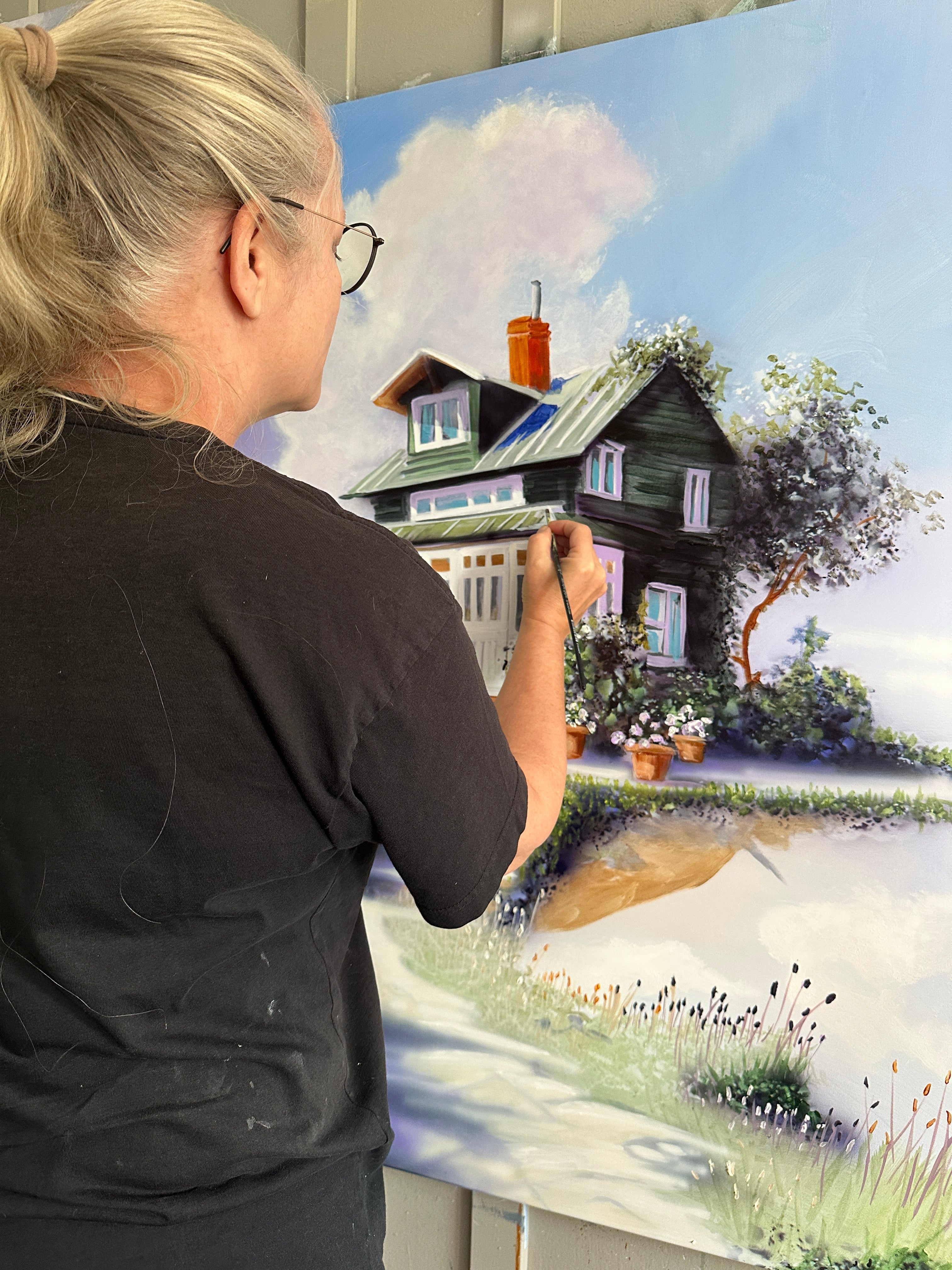 Jeg arbejder fuld tid med mine malerier, og jeg elsker det. Hver eneste dag, jeg står i atelieret og dypper penslen i farverne, føles som en gave. Naturen er min store inspirationskilde, ikke bare det, jeg ser, men også stemninger, lys, forfald og vækst. Når jeg ønsker noget helt særligt ind i et motiv, bruger jeg også AI som værktøj. Jeg udvikler et digitalt forlæg, som siden smelter sammen med det intuitive, sansende arbejde foran lærredet. Ofte aner jeg ikke, hvor det ender og netop det gør processen levende og spændende.